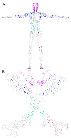The above analysis enabled us to specify the lymph flow directions in the graph edges, and ultimately, to generate an oriented graph of the human lymphatic system, which is shown in Figure 5A. As the dimension of the graph HLS model is high, it can be visualized in 2D being subdivided into six segments representing specific parts of the human organism: arms, legs, head and body. The resulting oriented subgraphs are presented in the Figure 5B.