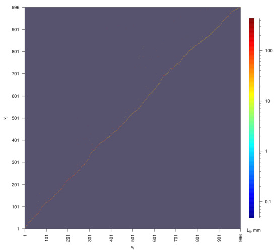 Adjacency matrix of the oriented data-based graph of human lymphatic system shown in Figure 5. Colors represent the lengths of the edges .