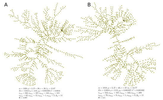 Two examples (A,B) of algorithmically generated realizations of rule-based directed random graphs of the HLS. The output nodes are marked with black color. Algorithm parameters: , , , , . The metrics of topological fitness to anatomy-based graphs presented in figure are defined in Section 4.