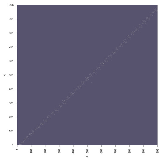 The permutations in the matrix are performed as follows: a pair of numbers is chosen at random. Then, in the matrix , columns number are swapped. After that, the same operation is performed with rows . From the point of view of the graph, such transformations mean a permutation of the designations of the vertices . Using this, we carry out a stochastic optimization of the matrix by the simulated annealing method to minimize (15). After that, we calculate the relative distance between graphs, presented by the adjacency matrices , as . Here, means a complete mismatch, means the complete equivalence of the adjacency matrices. By solving the minimization problem for the entire graphs, we achieved the upper bound estimate of the mismatch level of the range .