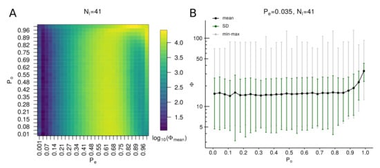 First, we investigate the landscape of topological fitness of algorithmically generated graphs over uniform ranges of admissible values of parameters and . The dependence of the objective function (14) on and is presented in Figure 10A. The colors correspond to logarithmically transformed mean values of objective function over 640 algorithm realizations for each set of parameter values. One can see that there is a narrow region in which the objective function reaches its minimum on the grid cells where . Next, we examine more closely the dependence of the objective function distribution on parameter for fixed , which is presented in Figure 10B. One can see that for a long range of parameter , the objective function values remain low, until they increase for large values , where the maximum degree of graphs become too large (the dependence of topological metrics on is presented in Figure S1). From Figure 10, one can estimate the following ranges of viable parameter values for and : , . Two examples of rule-based graphs with satisfactory topological fitness generated by the algorithm with the use of optimal parameters , are shown in Figure 7.