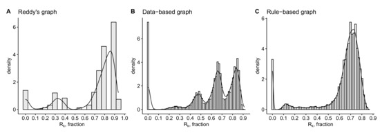 Histograms of the robustness of (A) Reddy’s graph, (B) anatomical data-based graph and (C) rule-based random graph presented in Figure 7A.