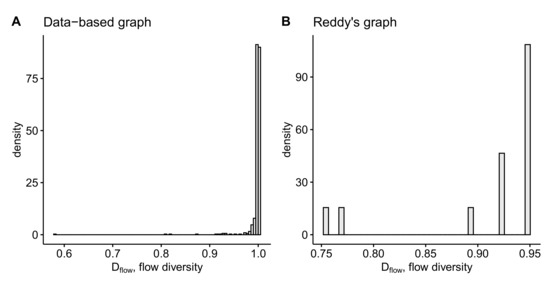 Histograms of the flow diversity of the inner vertices of anatomy-based graphs: (A) for data-based graph, (B) for Reddy’s graph.