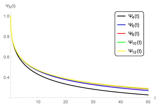 The calculations of the present results and graphs are deducted using the CAS Wolfram Mathematica. It can be seen from this table that the values of μ i are all less than one which satisfy the requirement of convergence of the present approximate solutions. The convergence of the sequence Ψ N ( t ) is also shown in Figure 1, where Ψ 4 ( t ) , Ψ 6 ( t ) , Ψ 8 ( t ) , Ψ 10 ( t ) , and Ψ 12 ( t ) are depicted at λ = 1 , q = 1.5 , and α = 0.5 . Figure 1 shows that the sequence of the approximations curves Ψ N ( t ) converges to a certain function as the number of terms N increases. Hence, the convergence is achieved in the whole domain of t. Regarding the rate of convergence, it was shown in Ref. [11] that if z j and z j are obtained by two homotopy and μ j < μ j for each j N , then the rate of convergence of j = 0 z j is higher than j = 0 z j .