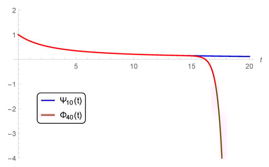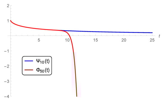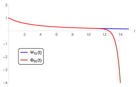 To confirm this point, a graphical comparison between the present 10-term approximate solution Ψ 10 ( t ) ( N = 10 ) and the 30-term approximate solution Φ 30 ( t ) ( M = 30 ) (Ref. [9]) is displayed in Figure 2 at λ = 1 , q = 1.5 , and α = 1 (ordinary derivative). In addition, Figure 3 shows the comparison between the present Ψ 10 ( t ) and Φ 40 ( t ) (Ref. [9]) at the same values of Figure 2, i.e., λ = 1 , q = 1.5 , and α = 1 (ordinary derivative).
