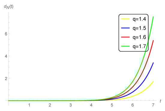 Besides, the comparison between Ψ 10 ( t ) (present) and Φ 50 ( t ) at λ = 1 , q = 1.5 , and α = 0.75 (fractional derivative) is plotted in Figure 4. It is observed from these figures that the solution in the literature coincides with our approximate one in specified subdomains. After such subdomains, our solution goes smoothly unlike the corresponding one in [9]. In addition, the number of terms needed to be taken from (52) is multiples of the current number of terms. The effect of the delay parameter q on the difference d N , defined above, is depicted in Figure 5 for N = 10 . The results reveal that d N is highly affected by increasing q. The preceding discussion shows the applicability and efficiency of the HPM in accurately solving the FAE.