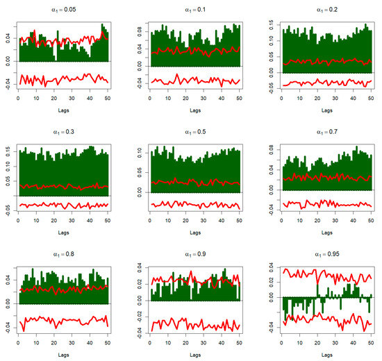 Assume that represents the order of the -th block with length ranging from to . In addition, denotes an independent and identically distributed variable with scalar parameter , . Moreover, is an illustrative of an independent and identically distributed order, drawn from a discrete uniform distribution . By utilizing observations, the bootstrap samples are obtained from the stationary bootstrap method. If , the pair is substituted by and , while stands for the modulo operator. This is completed as the upper limit of , which can surpass the sample size . Finally, on the basis of the sequence of random blocks, the stationary bootstrap method is employed when computing a confidence interval for each cross-quantilogram statistic.