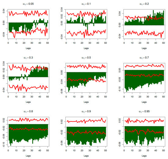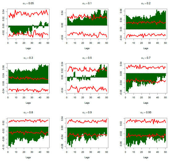 Figure 2 represents the case in which the TVRA is in its median quantile ( = 0.5), corresponding to typical market states as far as investor risk attitudes are concerned. We observe a weak level of negative dependency after some lags between the TVRA and , when are in their low quantile ( = 0.1). The estimated values are negative and significantly different from zero only for few lags. The latter means that when TVRA is very low, it is unlikely to have low levels of both in medium-term and long-term periods. At the same time, when are in their median quantile ( = 0.5), we report a positive dependency between TVRA and for a few lags only in the long-term period. When are in their high quantile ( = 0.9), however, a negative dependency is observed between TVRA and for the immediate short-term lags. The are found to be significantly different from zero after the first several lags for a greater number of lags, compared to the previous case. Therefore, we conclude that when TVRA is in its median levels, it is unlikely to have high levels of in both the short-and long-term periods. This suggests that typical risk aversion values do not necessarily capture predictive information over correlation jump dynamics, implying a regime specific predictability relation between investors’ risk preferences and correlation patterns.