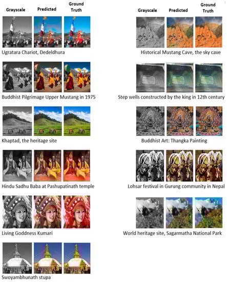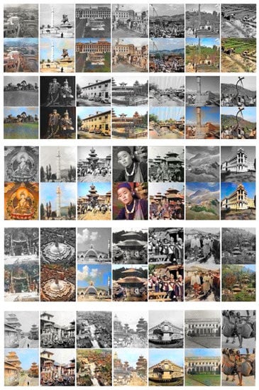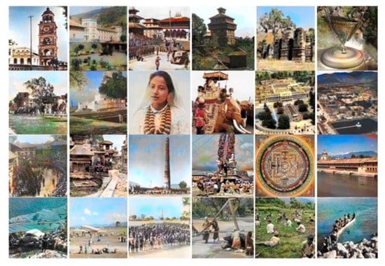 In order to train, test, and validate the colorization model, we create a dataset consisting of the heritage, historical, and cultural image repositories of Nepal. Most of the images were collected from the internet and are publicly available. Some such sources are Vintage Nepal, the Nepal picture library, the Department of Archaeology of the government of Nepal, cultural heritage blog spots, Getty images, etc. There are a wide variety of datasets for the colorization of grayscale images including the ImageNet dataset. To the best of our knowledge, no historical, cultural, and heritage image datasets in the context of ancient Nepal have been developed and used for colorization purposes. In Nepal, colorization of old historical, cultural heritage such as Thangka and Paubha (religious paintings that are made by the Newar people of Nepal) are still being colorized with manual painting or using Photoshop. Colorization of images can be seen in the form of painting the religious paintings of Hindu and Buddhist culture. Those traditional paintings can be found in the form of wall paintings, cloth paintings, or manuscripts. They used conservative technique, style, and iconography in their works for centuries. However, performance depends upon the skill of the artist. These images have enormous historical value and have recorded people’s lifestyles for more than a century. Most such images are black and white rather than color, and photographic technologies used a century ago are quite different from today. Thus, an automatic colorization technique is proposed that uses machine learning to create vibrant and realistic colors for those images. About 1.2 K images of size 256 × 256 including some validation images were collected with a variety of sources such as people and lifestyle, culture and religion, festivals, arts and architecture, museums and galleries, industries and economy, geography, history, paintings, statues, temples, monasteries, old squares, monuments, etc. Table 1 gives the summary of collected datasets. In addition, some sample images taken from the test dataset used for colorization are shown in Figure 2.