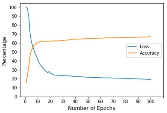 The Mean Squared Error (MSE) was taken as a loss function during model training. Adam with an initial learning rate LR = 0.001 was used as an optimizer. Choosing a proper batch size was difficult. A large amount of training was conducted to find the proper value of batch size. Initially, training was performed with parameters having varying batch sizes and epochs. Later, it was found that a batch size of 20 gives proper results. Figure 7 shows the plot of loss and accuracy versus the number of epochs of the trained model. It was found that a loss of 19.11% and 67.10% of model accuracy (see Table 3). Before taking the batch size of 20, we have applied a decreasing batch size of 10 as well as increasing batch size 25, but the network could not converge on loss and accuracy.