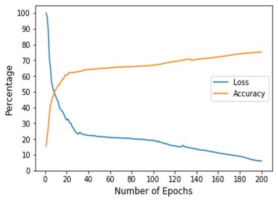 Graph showing loss (MSE)/accuracy vs. number of epochs (Dataset: 1.2 K, Batch Size: 20, number of Epochs = 200, Optimizer: Adam, loss = 6.08%, model accuracy = 75.23%).