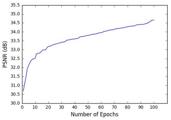 Plot of PSNR vs. number of epochs (Dataset: 1.2K, Batch size: 20, number of epochs: 100, Optimizer: Adam).