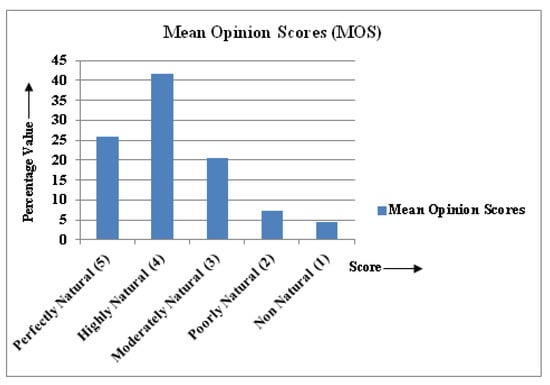 A quantitative measure of the performance of the model was obtained using MSE and PSNR, which is not sufficient to measure image color quality. A subjective quality assessment technique should be used which shows how the appearance of recolored images looks to the human eye. This evaluation was carried out by means of a user study [,,] called Mean Opinion Score (MOS) []. Twenty-nine colorized images were shown to users one by one, and each user was asked how to make sense of “Natural or Un-natural”, “Original or Re-colored”. Indications were given to the users to use their gut feeling and not try to spend too much time looking at the details of the images. Twenty-one different users have participated in the poll. We have chosen some best-recolored results for human visual perception. The MOS has been used for subjective quality assessment i.e., to test the naturalness of colorized images (see Figure 10). Both male and female, professional, and non-professional viewers rated the visual quality of colorized images obtained from the model. The MOS is generated by averaging the result of a set of standard, subjective tests. MOS is an indicator of the perceived image color quality. MOS of 1 is the worst image quality which is indicated by non-natural and 5 is the best, which is indicated by being perfectly natural.