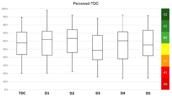 Perceived-TDC was carried out using the validated questionnaire assembled by Touron et al. []. This questionnaire is based on the INTEF Common Framework for the Teachers’ Digital Competence []. This instrument consists of 54 items distributed in five dimensions: information and information literacy (D1), communication and collaboration (D2), digital content creation (D3), security (D4), and problem solving (D5). The degree of knowledge was rated using a Likert scale from 1 to 7. In this way, proficiency levels were established (A0, A1, A2, B1, B2, C1, C2), where A0 corresponded to those who were completely unskilled with respect to TDC and C2 corresponded to a complete mastery of this competency. Overall perceived-TDC was rated by percentage and levels were determined using the following scale A0: [0, 14.3), A1: [14.3, 28.6), A2: [28.6, 42.9), B1: [42.9, 57.2), B2: [57.2, 71.5), C1: [71.5, 85.8), C2: [85.8, 100].