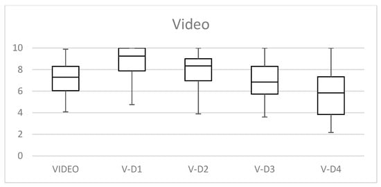 Box diagram showing the distribution of scores for the videos and scores for each of the 4 dimensions used to evaluate the videos (V-D1, V-D2, V-D3, and V-D4). The horizontal line within each box represents the median. The lower and upper limits of each box correspond to the 25th and 75th percentiles, and the lower and upper ends of the vertical lines refer to the outliers.