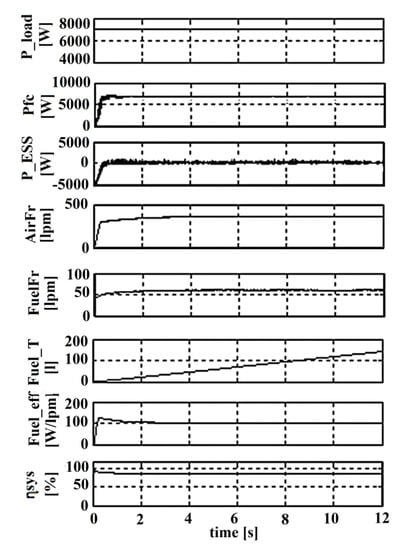 The behavior of the RES/FC HPS operating without RES power under 7 kW constant load power is shown in Figure 7 using the Fuel-LFW-based strategy. The plots in Figure 7 are as follows: the first graphic shows the 7 kW load; the second graphic shows the FC net power; the third graphic shows the ESS power; the fueling flow rates ( and AirFr) are illustrated in the next two graphics; the performance indicators (, and are represented in the last three graphics. In case of the Fuel-LFW-based strategy, the results obtained are as follows: FC net power () is 6170 W and the fuel flow rates are = 61.7 lpm and AirFr = 362 lpm; the fuel efficiency, total fuel consumption, and FC system energy efficiency are = 98,2 W/lpm, = 150 l, = 86%.