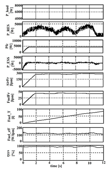 Besides the performance indicators that are usually used for RES/FC HPS during constant load demand such as the fuel consumption efficiency (Fueleff [W/lpm]) and the electrical energy efficiency of the PEMFC system (ηsys [%]), the Total Fuel consumption (FuelT measured in liters [l]) must be used for variable load demand: