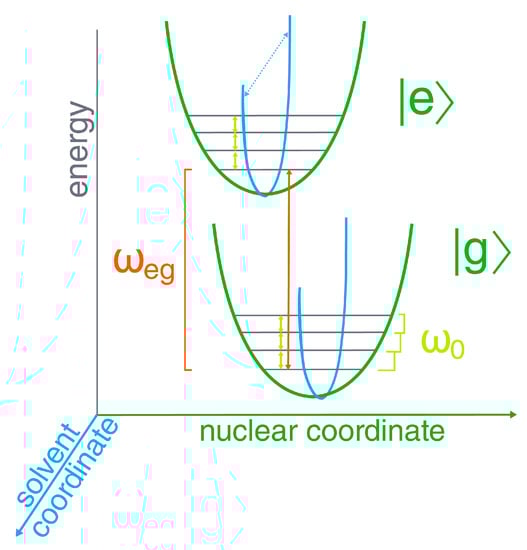 In this correlation function, the parameter represents the vibrational relaxation due to coupling to the solvent. Therefore, evaluating Equation (4) with the correlation functions for the nuclear modes (5) and solvent oscillations (7) yields their corresponding lineshape functions []: