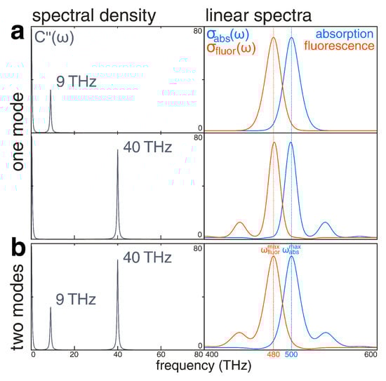 Spectral density, (left panels), and linear spectra from absorption and fluorescence lineshapes, and (right panels), calculated with (a) one mode with frequency 9 THz or 40 THz and (b) two modes with frequencies 9 THz + 40 THz. In the linear spectra, the frequency of maximum absorption () and the frequency of maximum fluorescence () are labeled.