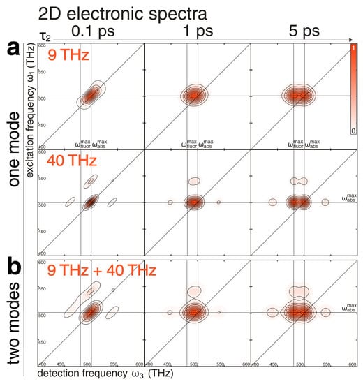 Next, we present the 2D electronic spectra for the same single-mode and multi-mode systems described above, which are shown in Figure 3. As expected, at early time points (≲1 ps) after simulated pulsed excitation, the 2D spectra show a single positive peak that is elongated along the diagonal. The elongated, ellipse-shaped peak results from the line-broadening included in , and is a typical feature observed in experimental spectra at early times due to spectral diffusion []. By 1 ps, the diagonal line-broadening has diminished and the main peak has dispersed. As relaxation occurs, another peak composed of the stimulated emission signal splits from the main ground-state bleach peak, while moving from the maximum absorption frequency toward the maximum fluorescence frequency, which is redshifted from the maximum absorption by the Stokes shift. In all simulations, relaxation completes by 5 ps, as evidenced by the separation of the two peaks by the full Stokes shift with the ground-state bleach signal remaining at the maximum absorption frequency and the stimulated emission signal shifted to the maximum fluorescence frequency along the axis of detection ().