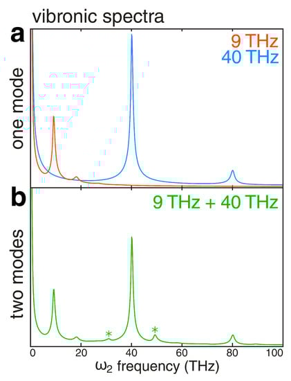 We selected vibrational frequencies of 9 THz and 40 THz as nuclear modes, and examined the spectra produced by the individual modes and the combination of both modes using the theoretical methods described above. Importantly, we selected the mode frequencies to be neither factors nor multiples of each other to distinguish their spectral peaks: This avoids misidentification of any potential overtone peaks from one mode as peaks due to interference between two modes. We also implemented an energy gap between the ground and excited electronic states with frequency THz, used a temperature high enough to satisfy the high-temperature limit [], and applied consistent solvent parameters 60 THz and 2 THz to maintain the extent of homogeneous broadening and relaxation across all simulations [].