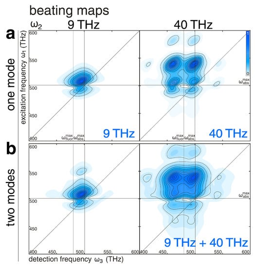 Beating maps (magnitude) shown at 9 THz or 40 THz. Beating maps were obtained from 3D electronic spectra simulated using (a) one mode with frequency 9 THz or 40 THz, and (b) two modes with frequencies 9 THz + 40 THz.