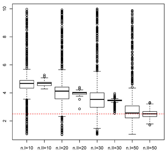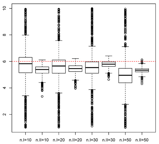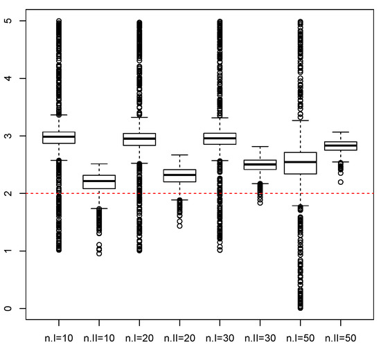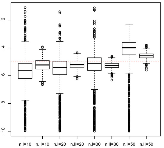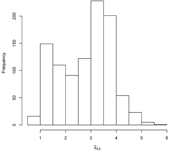- Obtain 100 sets of Bayes estimates through using procedure BE-I, and denote them by , , , , and . Find the mean of each set of Bayes estimates with 5% of them trimmed from each end. Denote the trimmed mean by , , , , and , respectively.
