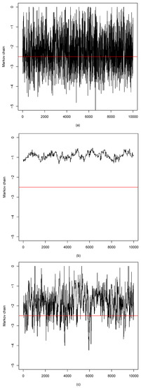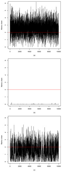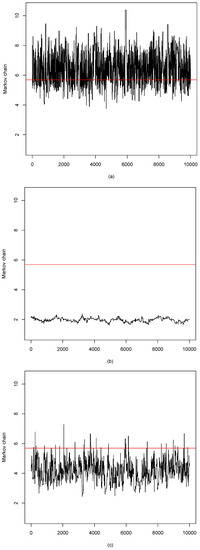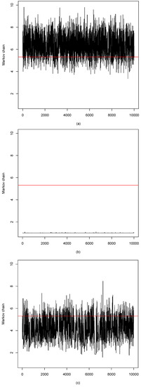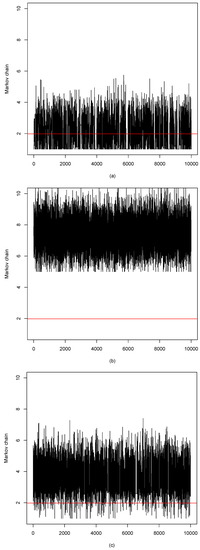 - Implement the Metropolis–Hastings algorithm via Gibbs sampling with the normal distributions, , , , , and , as the transition probabilities to obtain Bayes estimates. That is, the MCMC method is implemented based on the knowledge that is obtained from Step 1.