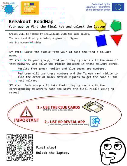 - Santos, M.J.; Miguel, M.; Queiruga-Dios, A.; Encinas, A.H. Looking for the Antidote for Contaminated Water: Learning Through an Escape Game. In Proceedings of the International Joint Conference: 12th International Conference on Computational Intelligence in Security for Information Systems (CISIS 2019) and 10th International Conference on EUropean Transnational Education (ICEUTE 2019), Seville, Spain, 13–15 May 2019; pp. 217–226. [Google Scholar]