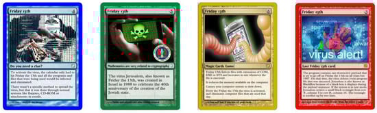 - Blue, red, green, and yellow Magic cards with different figures and text written on them. All of them with the name of different malware.