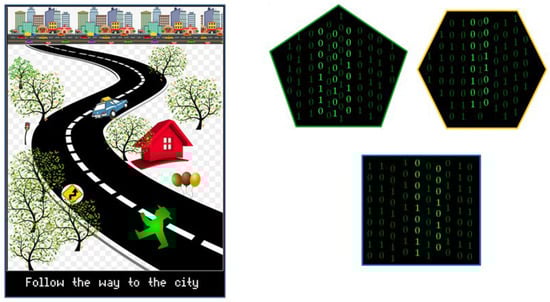 Figure 5. Magic cards’ riddle. - Red card: from the road map, players know that red team needs the numbers found by the rest of teams (6, 4, and 5), and the “green man” riddle to find the order of black Matrix figures (see Figure 6) to get the name of the next malware. This is a difficult riddle because gamers must pay attention to the green man and realise that green, yellow, and blue figures (in that order) are directed towards the city. This is the order of the Matrix geometric figures (the same as left figure): blue at the top (square, 4), yellow in the middle (hexagon, 6), and green at the bottom (pentagon, 5). After getting this, it is easy to convert binary numbers to decimal, and then get the corresponding letters: 19 (S)-20 (T)-21 (U)-24 (X)-14 (N)-5 (E)-20 (T).