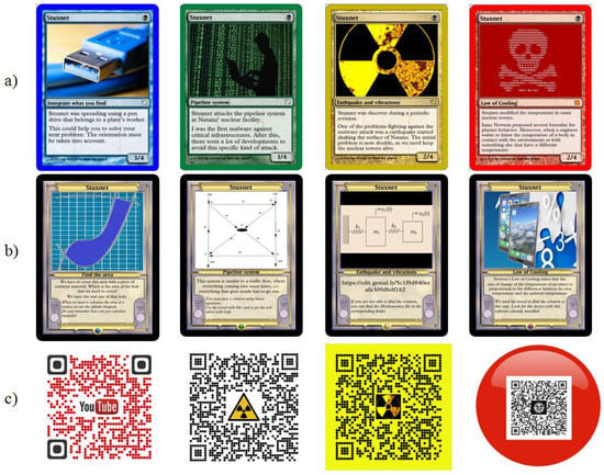 (a) Teams’ Stuxnet cards; (b) Clue cards when using HP Reveal over (a); (c) Final result when using HP Reveal over (b).