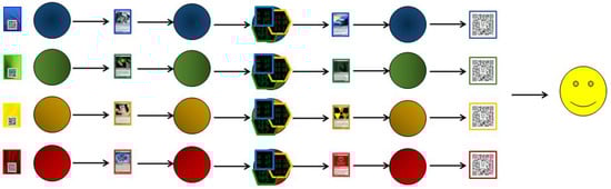 Apart from the identification, students are given a road map and instructions for the game, so they know that they form part of a specific team (either blue, red, green or yellow). They also know from the road map (see Figure 2) that some riddles and puzzles must be solved by the team and some others by all the teams working together. The most important thing for the game is that teams are identified by a color, a figure and a number (given by the number of sides of the figure). This will help players to solve the puzzles and finally to win.