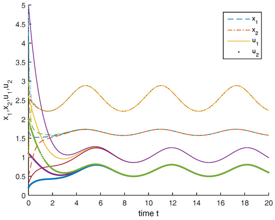 Dynamic behaviors of the solution of system (4.3) with the initial conditions = , and , respectively.