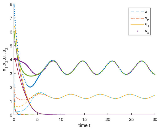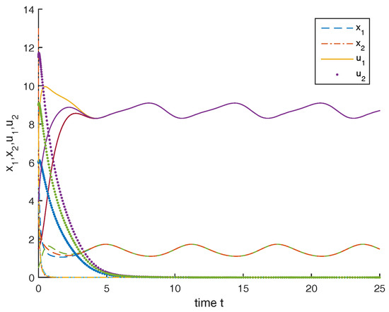 Clearly, , condition (43) are satisfied, from Theorem 3, we know that the second species is permanent and the rest of species is driven to extinction.