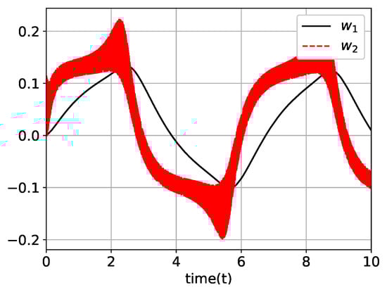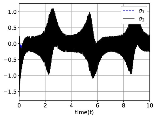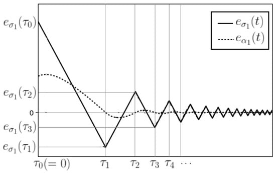 Then, Lemma 2 describes . For a description of the more specific behavior of , which is required in the proof process of the following Lemmas, define infinite time sequence , where changes its value (from 1 to −1 or vice versa). In [19], Park et al. showed that an infinite number of time intervals exists , such that . The changes its sign (i.e., crosses the line) at some time point . The fact that inequality holds for all , as also been proven in [19]. The typical trajectory of is illustrated in Figure 1. As shown in Figure 1, oscillates and its magnitude converges to zero asymptotically.