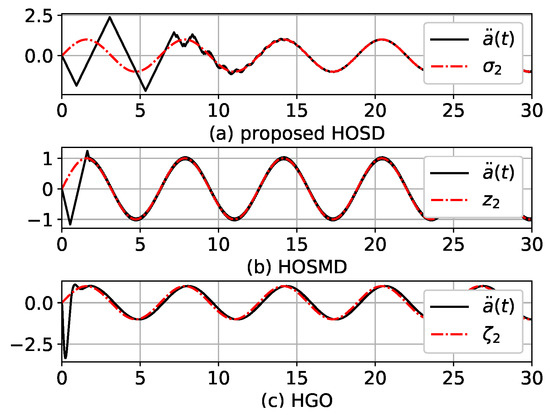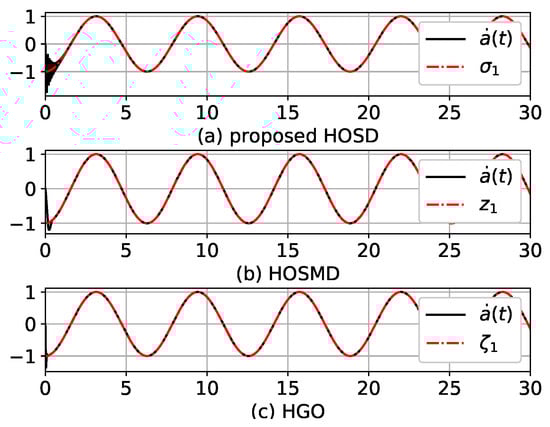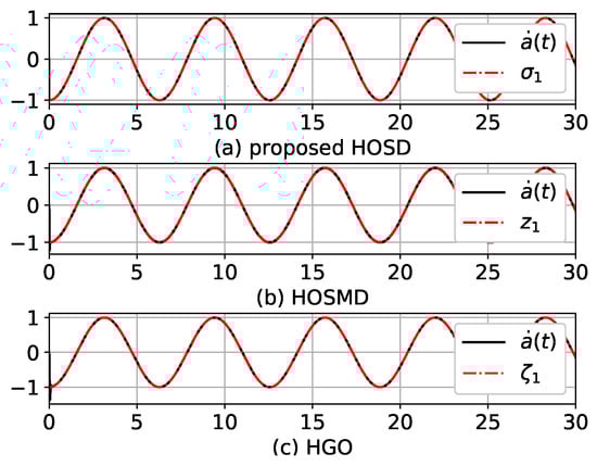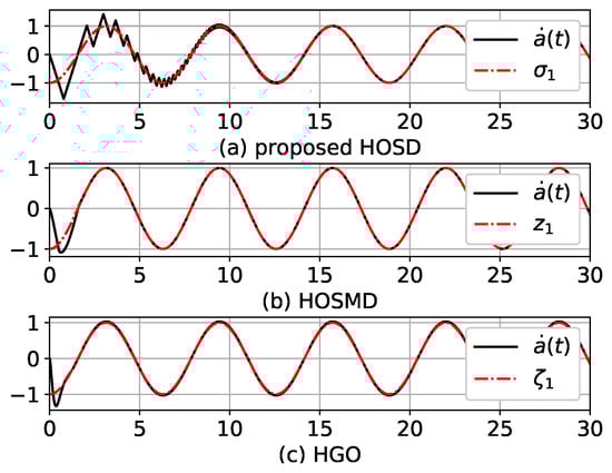 In this section, the performance of the proposed HOSD is shown via simulations. In the following simulations, Python language and its libraries, such as scipy, numpy, and matplotlib [21], are used. Time-derivatives of are estimated by the proposed HOSD, HOSMD, and HGO. Estimations were also compared. Time-derivatives of are and . First, the proposed HOSD equations of (8) and (9) were used to estimate and . The HOSMD is a second estimator whose dynamics are as follows: