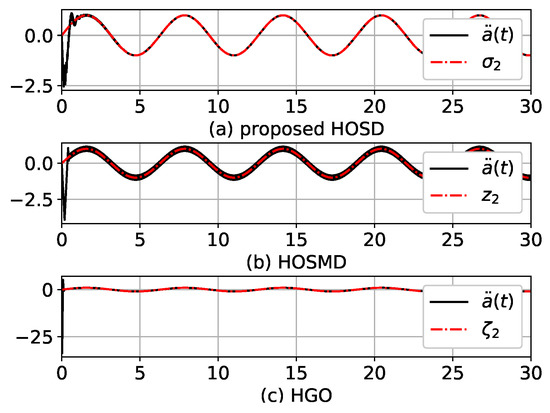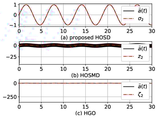 The parameter set ③ in Table 1 is stronger than those in sets ② and ①. Figure 6 and Figure 7 illustrate the results. In this case, the advantage of the proposed HOSD is even more pronounced. The estimations of HOSD seemed to be exact. No peaking or chattering were observed in or (Figure 6a and Figure 7a). However, in the estimation of HOSMD, peaking and chattering in existed as depicted in Figure 7b. In the case of HGO, huge peaking in at appeared (Figure 7c).