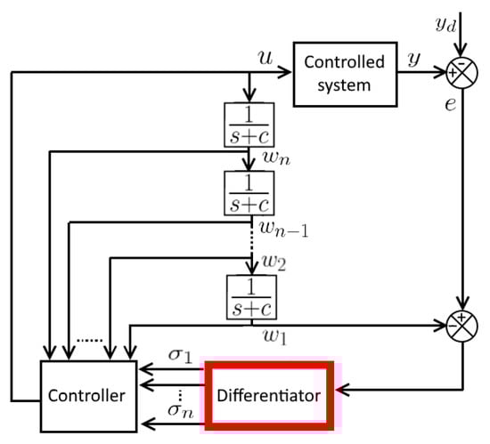 The biggest advantage of the differentiator-based controllers proposed in [9,10,22] is that the controller requires no universal approximators, such as neural net or fuzzy system, irrespective of the intrinsic unstructured uncertainties in a controlled system. Studies typically adopted such approximators to capture unstructured uncertainties for controlling uncertain nonlinear systems (e.g., refer to [8,23,24,25,26,27,28,29] and the references therein). Thecontroller (24) is directly influenced by the performance of the differentiator. The block diagram of the overall closed-loop control system is illustrated in Figure 8.