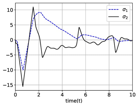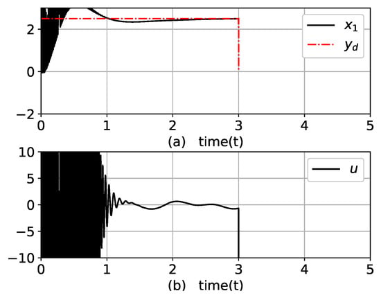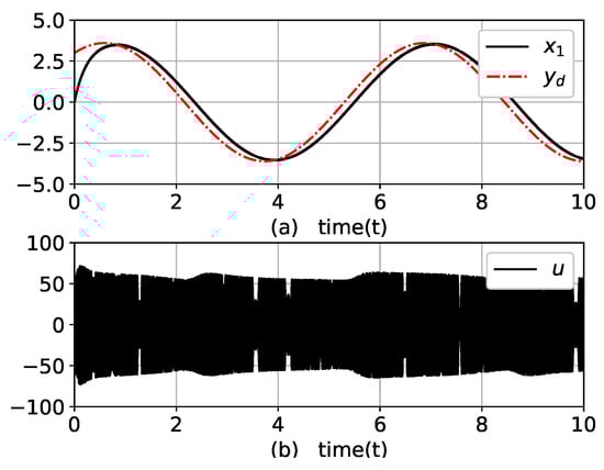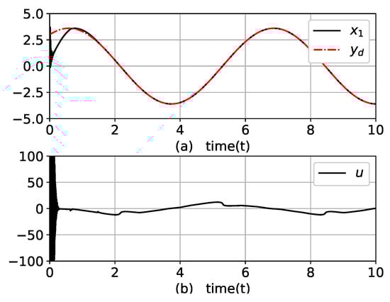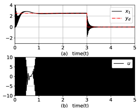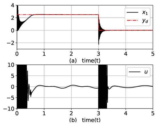 where and u are the output and input of the system, respectively; is an unmeasurable state variable. Note that the controller has no information on the dynamic equations and contained disturbances. Due to the term in (22), this example system is sensitive to small changes in the control input, which complicates the control of the output. The control objective was to drive for tracking while maintaining all signals as bounded.