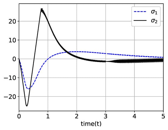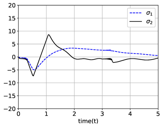 To prove convergence of , the conventional Barbalat’s lemma cannot be applied since the has a piecewise continuous function. By using Lemma 1 instead of Barbalat’s lemma, the following key aspects can be directly proven: