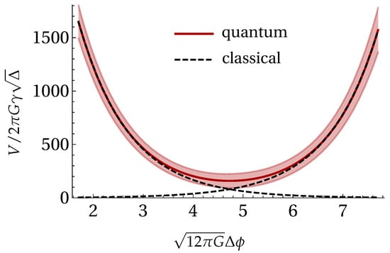 One might also wonder how far from the bounce we can trust our quantum evolution truncated at first order in W. The agreement of the quantum trajectory with the classical ones displayed in Figure 1 shows that the approximation remains valid well within the regime in which quantum corrections become negligible. Indeed, from the condition for validity obtained in [27], we are able to determine that the approximation is valid around the bounce for , which for our chosen parameters corresponds to .