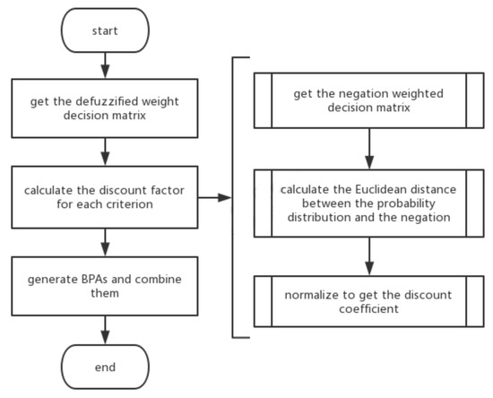In this section, we introduce a multi-criteria decision-making method based on negation of probability distribution. The specific flow chart is shown in Figure 1. By combining the D-S evidence theory with the negation of probability distribution, the fuzzy degree of the criterion is taken as the reference standard to calculate the discount coefficient of the criterion, which corrects the errors brought by the experts’ subjective evaluation of each criterion and improves the decision making level.