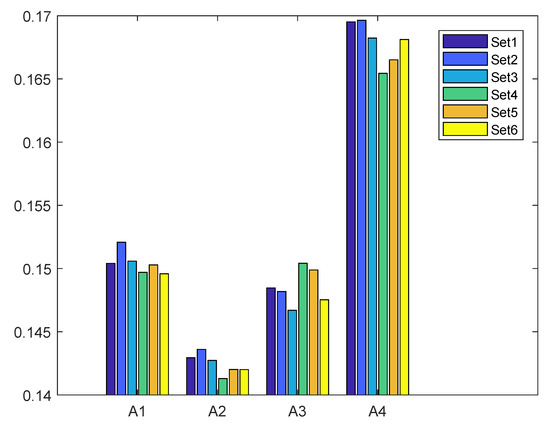 To study the robustness and stability of the proposed method, it is necessary to analyze the sensitivity of the subjective weight of the criteria. Since the importance evaluation of the criteria is determined by the decision-maker subjectively, there must be human errors caused by the subjective evaluation. Therefore, six groups of importance weights of the criteria are randomly selected, as shown in Table 15. The belief values corresponding to the alternative schemes are calculated, and the best scheme is selected.