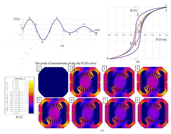 To understand the meaning of the hysteresis model better, the magnetization of the motor cross-section using hysteresis is presented schematically in Figure 1. The value of the excitation current (Figure 1a) changes from the value presented with point 1 to values in points 2, 3, … to point 8. Magnetization changes according to the curves presented between points marked at the hysteresis loop (Figure 1b) and appropriate magnetic flux density B at a cross-section of the motor for magnetization at each presented point (Figure 1c).