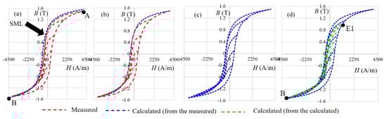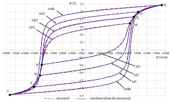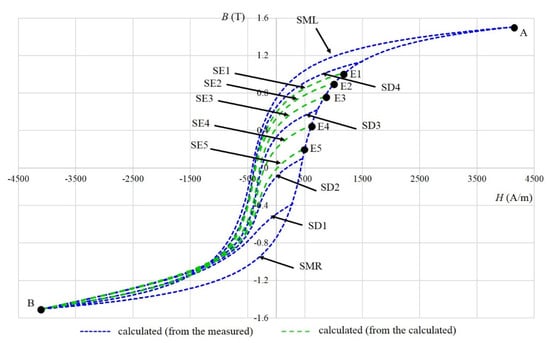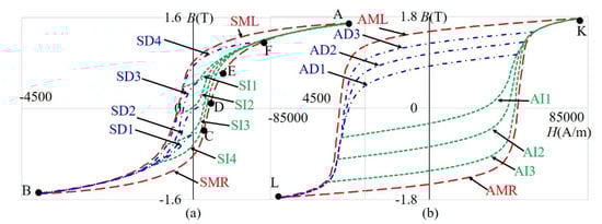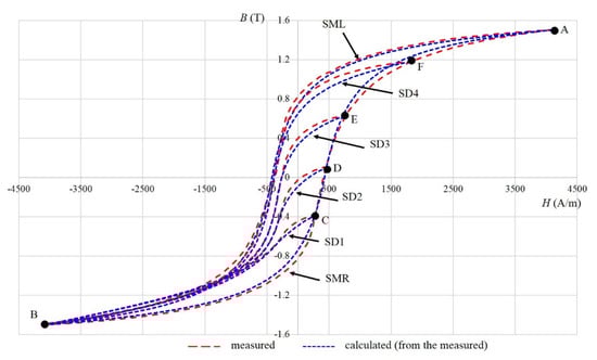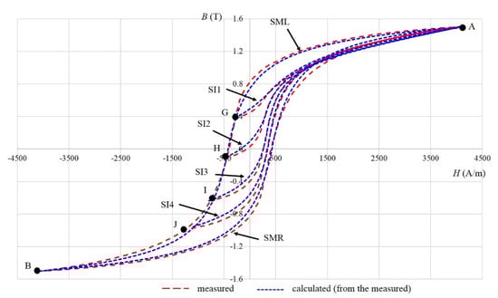 For the material 9S20, the parts of major hysteresis are marked with the left/right part of the measured major hysteresis loop (SML/SMR), decreasing first-order reversal curves are marked as SD1–SD4, and increasing first-order reversal curves are marked with SI1–SI4. For the material Alnico, the parts of major hysteresis are marked with the left/right part of the Alnico measured major hysteresis loop (AML/ AMR), decreasing curves are marked as AD1–AD3, and increasing curves are marked with AI1–AI3. The measured major hysteresis curve and first-order reversal curves were used to determine the parameters of the model. After that, only two points, the point at which the excitation is changed (for example, C–F in Figure 2) and the point at the ends of the hysteresis (for example, A and B in Figure 2), were used to determine the magnetization process in the hysteresis area between the measured curves.