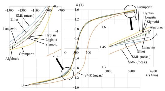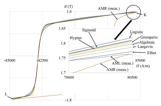 Hysteresis occurs in various fields of engineering work [,,]. In the past, different mathematical expressions were used for hysteresis modeling. The magnetization curve, and also hysteresis, can be modeled in the easiest way by using a Sigmoid function. In the literature, different expressions of the Sigmoid function can be found [], and it plays a very important role in hysteresis modeling. A Sigmoid function is a mathematical function, which usually has an “S” shape. It is real-valued and differentiable. It is used in many fields, such as in the field of Neural Networks, to describe the processes in the human brain, in mathematical psychology, etc. We selected seven mathematical expressions of Sigmoid function from []. The Langevin function is related to the Boltzmann law of magnetic moment distributions. Other functions are mathematical expressions in which parameters have less physical meaning. These are used to adjust mathematical expressions to hysteresis curves.