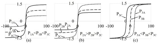 Mathematical models can be classified into two main categories: physical and phenomenological. The former (physical model) is created from the physics of a phenomenon, while the latter merely describes the end result with mathematical functions. Therefore, the latter is usually less complex, but it loses the connection to the physics of the material. Among the physical models is the Stoner–Wohlfarth model [], which is often used to describe events in ferromagnetic thin layers. The material is treated as a single magnetic domain. Jiles-Atherton [,,], on the other hand, also considers inter-domain interactions. Their main advantage is the connection with the physical parameters. More numerically oriented is the Preisach model of hysteresis [,,]. It enables the description of different forms of hysteresis loops that are constructed from the so-called hysterons. They can switch between −1 and 1, depending on whether the input data exceed the start-up or shut-off threshold. Other less known hysteresis models can be found, such as the Mayergoyz Vector Hysteresis model [], or Vector Magneto–Hysteretic H&S model [], and many modifications and corrections of existing models. The phenomenological, numerically oriented approach is presented in the paper.