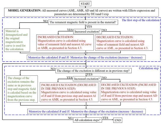 Different colors are used in Figure 14 to make the algorithm more transparent. The parts of the algorithm when a new magnetization curve must be calculated are marked with red. The parts of the algorithm when the magnetization curve remains unchanged due to the previous step or an original magnetization curve is used are marked with green. The calculation depends on the excitation change, and on the calculated values of H and B from the previous step, and these data must be memorized (marked with blue color).