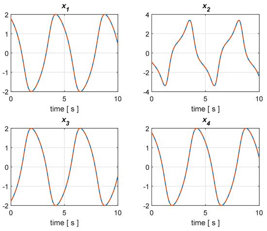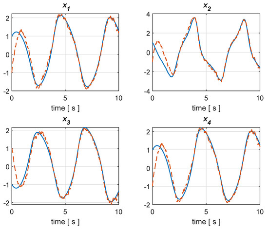 Simulation run without noises and with and , where the state variables are in blue and their estimates are in dashed red.